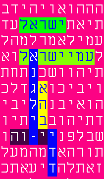 This is from Joshua 19:8-19. It is at an interval of 57. It describes the territory of Simeon encompassed by Judah and leads on to that of Zebulon. The first letter (white on black) also forms part of the name "SIMEON" (red on lime-green). ASHER (white on blue) is also recalled. The name ANGLIAH (i.e. ENGLAND in Modern Hebrew) touches at the bottom that of BETHLEHEM (white on maroon).